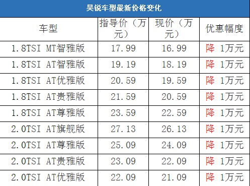 近日,編輯從北京地區(qū)上海大眾斯柯達4S經銷商處了解到,昊銳有少量現(xiàn)車(紅色、灰色和黑色);目前購車可以優(yōu)惠1萬元,經銷商透露消費者到店詳談還會有更多優(yōu)惠。以下是昊銳最新價格變化表: