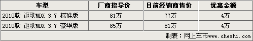 據(jù)北京地區(qū)謳歌4S店銷售人員透露,謳歌2010款MDX現(xiàn)車均已到店,車源比較充足。現(xiàn)在購車不僅可以享受到4萬元的現(xiàn)金優(yōu)惠外,還可以得到商家贈送的原廠汽車裝飾。部分顏色車型需要提前預(yù)定,訂貨周期在一周左右。目前北京地區(qū)有三家謳歌4S店,消費(fèi)者在購買前可以多去幾家4S店。