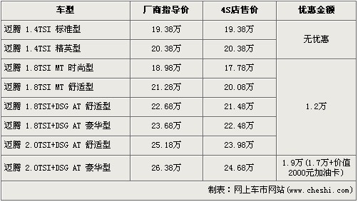 據(jù)北京一汽大眾經(jīng)銷店銷售人員介紹,邁騰全系最高配的2.0TSI自動(dòng)豪華版灰色車型近期出現(xiàn)了總價(jià)值1.9萬元的優(yōu)惠,其中包括了1.7萬元的現(xiàn)金優(yōu)惠,并且贈(zèng)送價(jià)值2000元的加油卡。銷售人員還介紹,邁騰新上市的1.4TSI車型停止了前段時(shí)間的加價(jià),店內(nèi)有現(xiàn)車,1.8TSI車型優(yōu)惠1.2萬元。