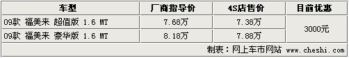 據(jù)4S店銷(xiāo)售人員介紹:09款福美來(lái)目前最高優(yōu)惠3000元,在北京地區(qū)銷(xiāo)售車(chē)型僅有兩款,分別為手動(dòng)超值版及手動(dòng)豪華版,售價(jià)分別為7.68萬(wàn)及8.18萬(wàn),優(yōu)惠后價(jià)格僅為7.38萬(wàn)。車(chē)款顏色方面,共有白色、銀色、黑色等暢銷(xiāo)顏色車(chē)型,如需預(yù)定需等半個(gè)月左右。