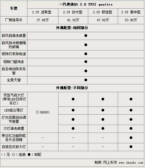 國產(chǎn)奧迪Q5全系均安裝了全景天窗,在車型均安裝了鋁飾行李架軌道,并且前風(fēng)擋以及側(cè)窗都安裝了帶有隔熱功能的吸能玻璃,愛美的女車主可以不必在為了怕曬黑自己,而涂上厚厚一層的防曬霜了。除了入門級的進取型之外,其他三款車型均安裝了帶有LED日間行車燈的雙氙氣前大燈,并且?guī)в星按鬅羟逑垂δ,LED尾燈也安裝上身。雖然進取型沒有標(biāo)配這些配置,不過只要您愿意,花費9000元這些配置同樣可以選裝上身。頂配的豪華版車型上,自適應(yīng)式前大燈可以比其他三款車型給駕駛員提供更人性化更廣闊的視野范圍。