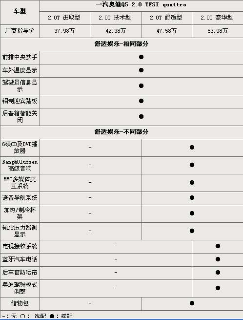 往往全系車輛的價格差異差的最多的就是在豪華娛樂配飾上面,奧迪Q5當(dāng)然也不例外。奧迪Q5舒適型以及豪華型配備了奧迪的第三代MMI多媒體交互系統(tǒng),通過精簡控制器,MMI可以迅速、方便、直觀地使用大量的功能和技術(shù)。播放器選用了帶有DVD功能的6碟CD系統(tǒng),而音響也是選用了丹麥的頂級音響品牌Bang&Olufsen,綜上幾個配置,都是在進(jìn)取型以及技術(shù)型上看不到的配置。頂配的豪華版車型,相比其他3款車型則多了電視接收系統(tǒng)、藍(lán)牙汽車電話等高科技味道十足的娛樂設(shè)備,而可以調(diào)節(jié)減震阻尼軟硬的奧迪駕駛模式系統(tǒng),也是只在頂配的豪華版車型上共享的。