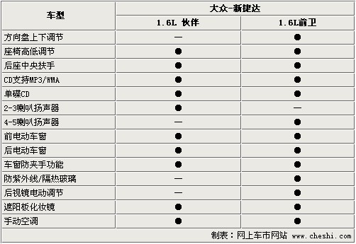 新推出的兩款車型保證了基本的舒適性及娛樂性,座椅高低調(diào)節(jié)及后排中央扶手提供了基本的配置。支持MP3/WMA的單碟CD音響方便了使用,兩款車只是在喇叭數(shù)量上有所區(qū)別。全車標(biāo)配電動門窗,對于捷達較低的價格而言也算難能可貴。但方向盤上下調(diào)節(jié)、防紫外線/隔熱玻璃、后視鏡電動調(diào)節(jié)在伙伴上并沒有出現(xiàn)?梢钥闯,廠家對于這款經(jīng)濟型轎車的成本控制還是很嚴格的。