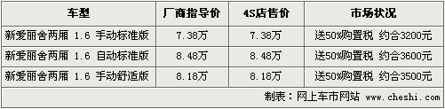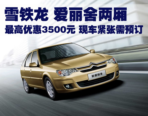 東風雪鐵龍愛麗舍從9月份開始,對車型進行了一次全面升級。2010款新愛麗舍在安全、舒適、節(jié)油和性能方面比老款有增加了相應的配置,進一步強化了新愛麗舍成熟的產(chǎn)品品質(zhì)。而09款兩廂愛麗舍更具城市便利性,其備箱空間絲毫不亞于三廂車型,是繼富康后的又一經(jīng)典兩廂叫用車。根據(jù)網(wǎng)上車市價格監(jiān)測系統(tǒng)顯示,目前購買愛麗舍兩廂,可享受購置稅減半,折合最高優(yōu)惠約3600元。具體車型價格行情如下: