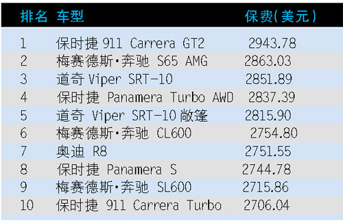 第一名跟第十名的保費(fèi)差距大約也才只有240美金,而在前十名之后的11~20名中,基本上都是梅賽德斯·奔馳的天下,包括CL65 AMG、S600、SL65 AMG以及CL63 AMG都入選在內(nèi),除此之外,還有寶馬M6(硬頂及敞篷版)和760i以及兩款捷豹XKR機(jī)械增壓版本。不過(guò),文章并沒(méi)有講明保險(xiǎn)金額的實(shí)際保障內(nèi)容是什么,所以跟國(guó)內(nèi)的保費(fèi)也不太好比較?墒,可以看出,榜單中的這些車輛售價(jià)也并不便宜,這點(diǎn)兒保費(fèi)還真不算什么。(記者陳鑫欣)