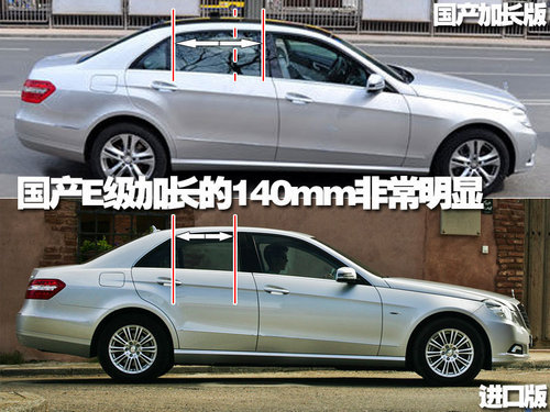 從上面進(jìn)口原裝奔馳E級(jí)轎車與國(guó)產(chǎn)奔馳新E級(jí)轎車加長(zhǎng)版的對(duì)比可以發(fā)現(xiàn),國(guó)產(chǎn)新車型的加長(zhǎng)部分全部出現(xiàn)在B柱之后,而這部分也是決定后排乘客腿部空間最為重要的部分。我們可以從后窗的面積非常直觀的看出加長(zhǎng)前后的明顯區(qū)別。