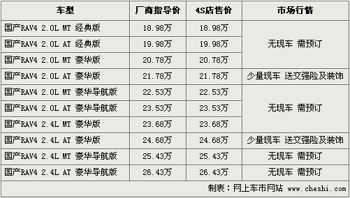 受豐田“召回門”的影響,RAV4持續(xù)的加價現(xiàn)象已經(jīng)不復(fù)存在。據(jù)一汽豐田4S店銷售人員介紹,目前豐田RAV4購車可 獲贈交強(qiáng)險,并且還贈送千元的裝飾禮包,裝飾包括:貼膜、腳墊、坐墊等可供消費者選擇,F(xiàn)車方面不太齊全,2.0L只有豪華版有少量黑色現(xiàn)車,2.4L有 豪華版銀色、黑色等現(xiàn)車供應(yīng),相比前段時間現(xiàn)車供應(yīng)緊張的狀況,目前的供貨慢慢趨于緩解。行情信息多變,請以當(dāng)日行情為準(zhǔn)。