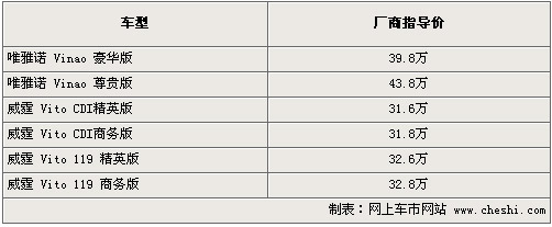 2010年4月23日,前不久在福建戴姆勒工廠下線的國(guó)產(chǎn)梅賽德斯-奔馳唯雅諾、威霆即將正式亮相北京車(chē)展,這標(biāo)志著奔馳全面吹響進(jìn)入高端MPV市場(chǎng)的號(hào)角。新工廠的竣工投產(chǎn)、新產(chǎn)品的下線展示,揭開(kāi)神秘面紗的唯雅諾、威霆在各自的展臺(tái)上格外引人注目,他們分別位于W4館和E601號(hào)。售價(jià)為:Vinao 豪華版 39.8萬(wàn);Vinao 尊貴版 43.8萬(wàn);Vito CDI精英版 31.6萬(wàn);Vito CDI商務(wù)版 31.8萬(wàn);Vito 119 精英版32.6萬(wàn);Vito 119 商務(wù)版32.8萬(wàn)。