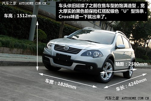 駿捷Cross的車(chē)身尺寸為4240mm×1820mm×1512mm,軸距依然為2580mm,與原型車(chē)駿捷FRV相比,除了底盤(pán)升高了20mm之外,中華駿捷Cross加裝了前后大包圍,標(biāo)配的全鋁制車(chē)頂行李架和蜂窩狀的進(jìn)氣格柵增加了動(dòng)感和活力,輪轂由FRV的15寸升級(jí)為16寸的鋁合金輪轂,在增強(qiáng)視覺(jué)效果的同時(shí),也使檔次得到一定提高。