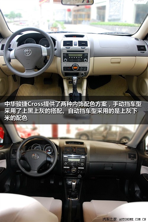 與個(gè)性的外觀相比,駿捷Cross在內(nèi)飾上似乎并沒(méi)有體現(xiàn)出什么特點(diǎn),呈現(xiàn)的一派典型的轎車(chē)化風(fēng)格,做工在自主品牌里面算是比較出色的,而且樣式也絕對(duì)不亞于同價(jià)位的合資車(chē)型,其中手動(dòng)擋車(chē)型采用的是上黑下灰的配色方案,而自動(dòng)擋車(chē)型則為更接近結(jié)局的上灰下米的色彩搭配。