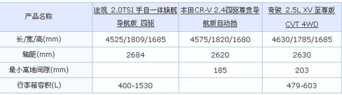 從車內(nèi)空間與乘坐的人性化設(shè)計(jì)來看,都不得不承認(rèn)——途觀是3款車中的勝利者;而CR-V則只是顯露出了幾分老態(tài);奇駿的車內(nèi)乘坐空間表現(xiàn)還不錯(cuò),匠心獨(dú)具的后備箱是一大亮點(diǎn)。