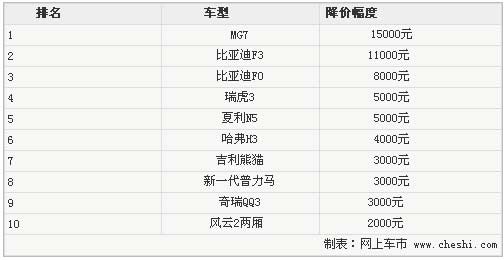 隨著國(guó)內(nèi)汽車市場(chǎng)逐漸升溫,很多汽車品牌也開(kāi)始了市場(chǎng)爭(zhēng)奪戰(zhàn),很多熱門車型在進(jìn)入五月份以來(lái),都出現(xiàn)了較大的優(yōu)惠幅度。據(jù)網(wǎng)上車市網(wǎng)站了解,很多自主品牌熱門車型在北京汽車市場(chǎng)已經(jīng)開(kāi)始出現(xiàn)了初步的價(jià)格戰(zhàn),比如比亞迪F3、MG7等熱門車型都出現(xiàn)了萬(wàn)元以上的優(yōu)惠幅度。這對(duì)很多消費(fèi)者來(lái)說(shuō)算是個(gè)比較好的消息,接下來(lái)讓我們?nèi)チ私庖幌戮烤褂心男┸囆蛢?yōu)惠幅度最多。