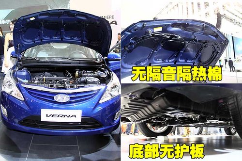 北京現(xiàn)代Verna的發(fā)動機艙布局比較規(guī)整,走線合理。在發(fā)動機蓋上輔以隔音材質(zhì),同時在靠近發(fā)動機后方的部分也設(shè)有隔音、隔熱層。車輛底部沒有裝備的底盤護板,使Verna在復(fù)雜路面行駛時其底盤少了一重保護,而且這款車型的發(fā)動機艙蓋開啟沒用采用液壓桿的設(shè)計。