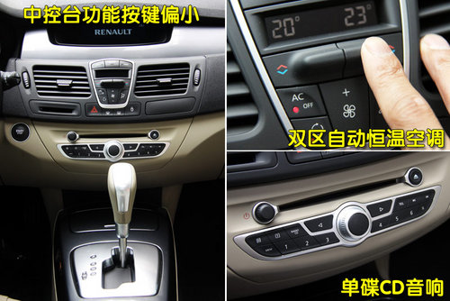 中控臺中細(xì)小的按鍵不知道法國人何時(shí)能夠?yàn)榇烁淖円幌拢氘?dāng)初進(jìn)入到C5車內(nèi)時(shí),被琳瑯滿目的小按鍵搞的暈頭轉(zhuǎn)向,并且在駕駛時(shí)我是不敢隨意去觸碰那個(gè)區(qū)域的。不過還好拉古那中控臺按鍵并不是很多,空調(diào)區(qū)域的造型很時(shí)尚,也很節(jié)省空間,實(shí)際操作也非常容易上手,調(diào)節(jié)方式也很簡便。另外老款的拉古那配備的是多碟CD,而新款車型裝配的則是單碟CD音響,在日常使用中,多少會有一些不便。