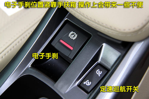 電子手剎的位置位于手扶箱前側(cè),實(shí)際操作中按照正常坐姿會感覺到有一些不便,但該功能在使用中比較便利,按鍵阻尼的手感也比較適中,并且電子手剎的配置確實(shí)非常實(shí)用。在電子手剎旁則是定速巡航系統(tǒng)的開關(guān)鍵,這與前段時(shí)間評測的科雷傲相同,同樣在使用中會感到一些不便,我甚至在想,為什么不能把這個(gè)功能都整合到方向盤中呢?