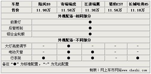 外觀方面,五款車均配備了獨立設(shè)計的前霧燈、后窗雨刷和鋁合金輪轂。而奇瑞瑞虎還配備了大燈高度調(diào)節(jié)功能,其他車型并未裝備。瑞虎、瑞鷹還為大家配備了更貼近家庭使用的電動天窗,雖然天窗的實際使用率并不高,但是偶爾使用也是很愜意的。除了獵豹CS7,其余4款車都配備了車型行李架,為出行載物提供了不少的便利。