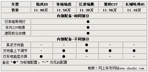 既然是一款SUV,我們就不能以評價(jià)轎車的標(biāo)準(zhǔn)來衡量它,畢竟造車的出發(fā)點(diǎn)是不同的。SUV車型更看重內(nèi)部載人載物的能力、駕駛安全性等能力。一些時(shí)尚新鮮的內(nèi)部配置我們還是留著在轎車上體驗(yàn)吧。三款車的內(nèi)部都配備了行李箱照明燈、12V電源和遮陽板化妝鏡。但是在5款車中,僅有瑞鷹為使用者提供了更顯檔次的真皮方向盤。