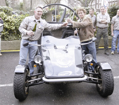 風(fēng)扇汽車既可以在崎嶇不平的沙地飛馳,又能像飛機(jī)一樣在空中飛行。在降落傘和一個(gè)巨型風(fēng)扇發(fā)動(dòng)機(jī)的幫助下,探險(xiǎn)家們計(jì)劃先在安道爾附近的比利牛斯山脈上空飛行,穿越14公里長(zhǎng)的直布羅陀海峽,接下來,將飛越摩洛哥阿特拉斯山脈和撒哈拉沙漠,哪里沒有了公路,他就從哪里發(fā)動(dòng)風(fēng)扇發(fā)動(dòng)機(jī)駕車升空。