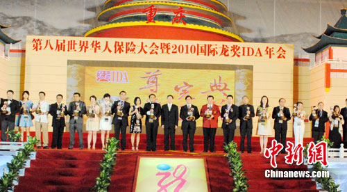 中新網(wǎng)重慶8月6日電 (連肖)6日晚,華人保險(xiǎn)業(yè)最高榮譽(yù)——2010年國(guó)際龍獎(jiǎng)IDA頒獎(jiǎng)儀式在重慶舉行,近兩千保險(xiǎn)界華人獲獎(jiǎng),932位獲獎(jiǎng)?wù)邅碛宓桥_(tái)領(lǐng)獎(jiǎng)。