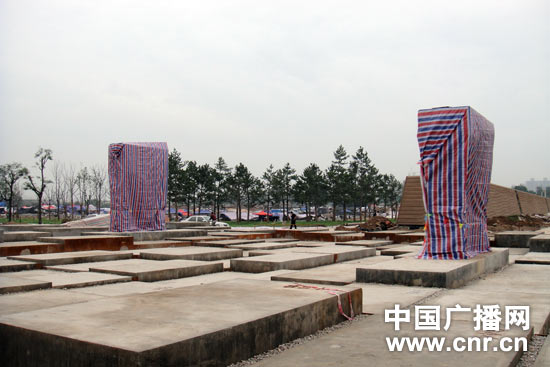 公園南面的崇明門,廣場(chǎng)中央立著兩個(gè)被塑料紙包起來(lái)的雕塑,透過(guò)塑料紙的縫隙可以看到,里面是鐵銹色的鋼板,鋼板中間是一面紅色的城門,紀(jì)大爺說(shuō),這種鐵銹色的鋼板是從德國(guó)進(jìn)口的,這樣的雕塑本來(lái)有5個(gè),現(xiàn)在拆得只剩下兩個(gè)。