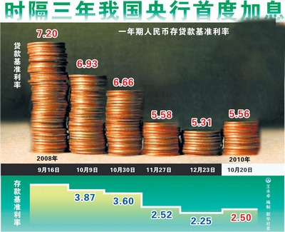 出乎市場的意料,中國人民銀行19日晚間突然宣布,自2010年10月20日起上調(diào)金融機構(gòu)人民幣存貸款基準利率。這是我國央行時隔3年后的首度加息,央行為何選擇此時加息?加息是否意味貨幣政策突變?加息對金融市場和房地產(chǎn)市場將產(chǎn)生怎樣的影響,新華社記者就此采訪了相關(guān)的專家和學(xué)者。