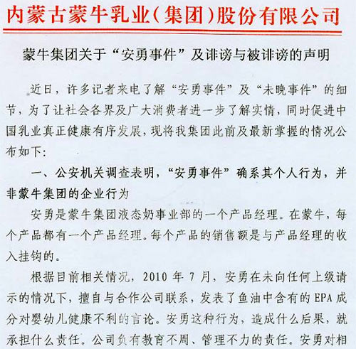 蒙牛集團關(guān)于“安勇事件”及誹謗與被誹謗的聲明