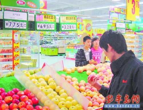 26日上午,記者走訪了家樂福、佳世客、大潤發(fā)等超市,發(fā)現(xiàn)質(zhì)量比較好的紅富士定價全都在七元左右!斑@哪是蘋果旺季啊,價格比淡季賣得都高!辈簧兕櫩统虺蚣t彤彤、新鮮香甜的大蘋果,再看看“價格不菲”的標(biāo)價牌,望而卻步。