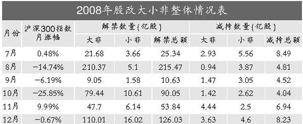 數(shù)據(jù)顯示,去年12月兩市共產(chǎn)生股改解禁股126.03億股,其中大非為110.01億股,小非為16.02億股,從滬深兩市來(lái)看,滬市解禁數(shù)量為79.94億股,深市解禁46.09億股。而當(dāng)月大小非減持?jǐn)?shù)量高達(dá)8.23億股,比去年11月份減持量增加15.6%,比去年7~12月平均每月減持量多出2.06億股,創(chuàng)出去年8月份以來(lái)的新高,僅比去年7月大小非減持最高峰少了0.26億股。