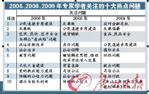 調(diào)查顯示,反腐倡廉和公民道德素質(zhì)建設(shè)依然位于專家學(xué)者關(guān)注的十大熱點(diǎn)問(wèn)題前列,分列第2位和第4位。