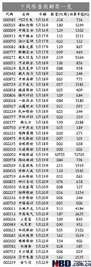 市場人士認(rèn)為,下周限售股解禁壓力集中在中小板的 “大小限”和有增發(fā)限售股解禁上市的這類公司上,而股改限售股的壓力較小。