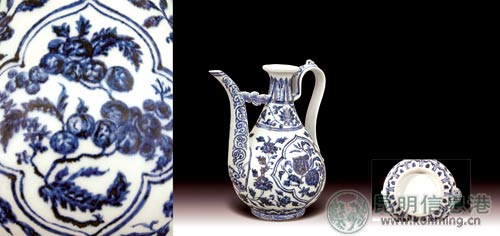 據(jù)云南典藏有關(guān)負責人介紹,拍賣“標王”青花開光折枝花果紋執(zhí)壺通體施以白釉,釉質(zhì)青白透澈,肥潤晶瑩,青花發(fā)色翠藍深沉,局部有鐵銹斑,圖案為上等“蘇麻離青”鈷料所繪。從文物藝術(shù)品的收藏價值來看,執(zhí)壺整器端莊大氣,做工精湛,屬于明代永樂時期青花瓷中的代表之作。目前,除國內(nèi)外的文物館藏之外,同類器物能在國內(nèi)外市場上流通的可謂屈指可數(shù),很少見諸于市,因此也就更加彌足珍貴了。