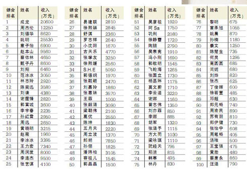 本次榜單前三名均來(lái)自港臺(tái)地區(qū),56歲的功夫巨星成龍登上榜首,去年5月他成為在“鳥巢”舉辦個(gè)唱的第一人,150多名明星嘉賓輪番登臺(tái),觀眾超過(guò)7.5萬(wàn)人。周杰倫位居第二,沒有新唱片并不影響商家和粉絲的追捧,他努力嘗試新的影視作品,有得有失。排在第三位的劉德華出演了3部電影,由于婚事曝光備受關(guān)注。今年雖共有43位明星來(lái)自港臺(tái),但其成就卻都仰仗于大陸市場(chǎng)。在他們眼中,兩岸三地之間的界限越來(lái)越模糊。小巨人姚明仍穩(wěn)居大陸第一名。章子怡緊隨其后,雖然飽受爭(zhēng)議仍獲得25個(gè)封面報(bào)道。