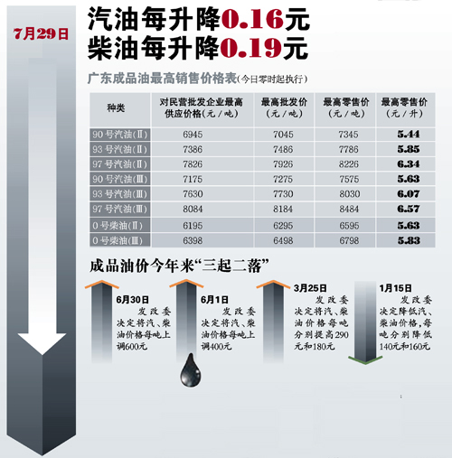 隨后,省物價(jià)局根據(jù)國家規(guī)定,也制定公布了廣東省的成品油銷售價(jià)格。這也是全省成品油價(jià)格繼6月份一個(gè)月內(nèi)連續(xù)2次上漲之后,首次出現(xiàn)下調(diào)。降價(jià)的幅度從0.16元/升~0.20元/升不等,其中國Ⅲ標(biāo)準(zhǔn)97號(hào)汽油降價(jià)最多,降價(jià)后每升最高零售價(jià)為6.57元。