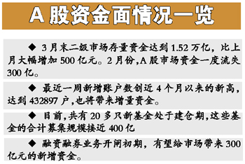 由上海證券報(bào)和申銀萬國(guó)研究所聯(lián)合推出的股市月度資金報(bào)告顯示,今年3月末,A股市場(chǎng)的存量資金在經(jīng)歷了近3個(gè)月的盤底振蕩后開始上升,當(dāng)月末二級(jí)市場(chǎng)存量資金達(dá)到1.52萬億,比上月大幅增加500億元。這個(gè)跡象,使得二月份一度明顯流失的市場(chǎng)資金面再度回穩(wěn),此前的2月份,A股市場(chǎng)資金一度流失300億。