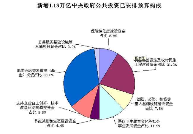 此外,2009年中央政府公共投資預算總量為9080億元,比上年增加4875億元,分項目安排情況如下:用于保障性住房建設資金493億元,占5.4%;農業(yè)基礎設施及農村民生工程建設資金2522億元,占27.8%;鐵路、公路、機場等重大基礎設施建設資金2134億元,占23.5%;醫(yī)療衛(wèi)生教育文化等社會事業(yè)發(fā)展資金926億元,占10.2%;節(jié)能減排和生態(tài)建設資金696億元,占7.7%;支持企業(yè)自主創(chuàng)新、技術改造及結構調整資金633億元,占7.0%;地震災后恢復重建(基金)投資1300億元,占14.3%;公共服務基礎設施等其他項目資金376億元,占4.1%。