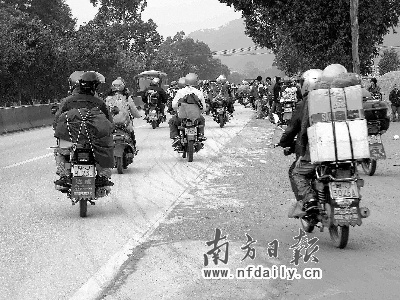 戴上頭盔、披上雨衣、載上家人,回家過(guò)年。春節(jié)臨近,由佛山、東莞、廣州等珠三角城市返鄉(xiāng)農(nóng)民工組成的10萬(wàn)“摩托車返鄉(xiāng)大軍”,沿著321國(guó)道返回廣西、貴州、湖南和四川老家過(guò)年。他們穿著厚實(shí)的棉衣,結(jié)實(shí)的綁腿,棉質(zhì)護(hù)膝,防風(fēng)頭盔,皮手套,或成群結(jié)隊(duì),或獨(dú)馬單騎,車上大多數(shù)是小兩口子,或者夾帶一個(gè)小孩,奔馳在國(guó)道上,成了春運(yùn)交通線上一道道特殊的風(fēng)景。