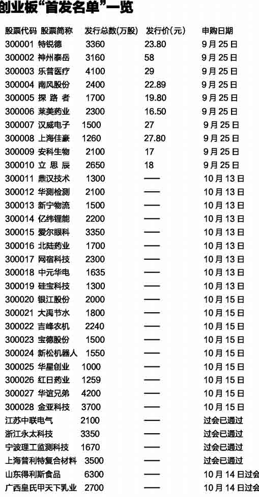 昨天,第三批創(chuàng)業(yè)板企業(yè)再獲IPO批文。華誼兄弟等9家企業(yè)發(fā)布招股意向書,昨天起進(jìn)行網(wǎng)上路演、初步詢價(jià)和現(xiàn)場(chǎng)推介,10月13日確定發(fā)行價(jià)格,10月15日集中申購(gòu)。自創(chuàng)業(yè)板開閘以來(lái),已有28家企業(yè)相繼進(jìn)入招股程序,掛牌上市指日可待。分析人士指出,這28家公司將是創(chuàng)業(yè)板開市“首發(fā)名單”。