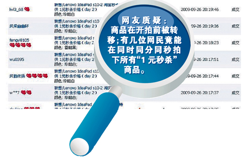 淘寶的安民公告,仍然為部分網(wǎng)友所不能接受。天涯網(wǎng)友“秋風(fēng)月無痕”認(rèn)為,淘寶沒出面解釋何以有三人能在同一分同一秒同時(shí)秒下三件商品!皟(nèi)有種種怪異之事,不得不讓人想到這是一場(chǎng)欺騙廣大中國(guó)人民的炒作行為。如果淘寶不能給出合理的讓人信服的解釋,那么最終受害的不單單是廣大受騙的群眾,更是淘寶網(wǎng)! “秋風(fēng)月無痕”及幾名網(wǎng)友隨后在跟帖中貼出當(dāng)晚截圖,聲稱既然當(dāng)晚人太多,“不能正常瀏覽頁面”,而實(shí)際上商品已經(jīng)在20時(shí)03分之前下架,但網(wǎng)友卻截圖發(fā)現(xiàn)有多條20時(shí)17分到20時(shí)19分的記錄,“淘寶怎么解釋這幾條記錄,03分到17分之間是空的,但是17分到19分之間突然冒出幾條記錄,這能讓人不懷疑是做了手腳嗎?”