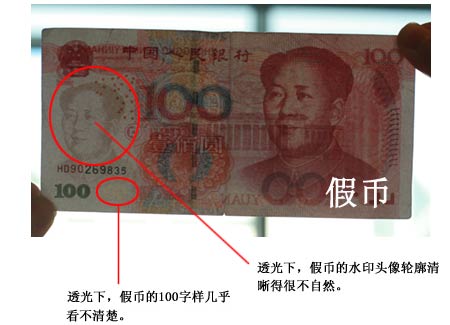 一看。即看鈔票上的固定人像水印、白水印、光變油墨面額數(shù)字、交印對應(yīng)圖案、隱形面額數(shù)字等特征。據(jù)介紹,真鈔票的“固定人像水印”有立體感,清晰度高,“白水印”的高透光反光性強,“交印對應(yīng)圖案”是一個圓形方孔錢。這三處在迎光透視時都可以清楚看見;光源角度發(fā)生改變時,真幣的“光變油墨面額數(shù)字”會有綠色和藍(lán)色顏色的漸變;此外,在與眼睛平行上下抖動時,可以看到“100”的隱形面額數(shù)字。