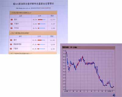 2月5日,聯(lián)想宣布柳傳志重掌聯(lián)想的消息后,新浪網(wǎng)隨后對(duì)柳傳志復(fù)出進(jìn)行了問(wèn)卷調(diào)查。截至第二天上午九點(diǎn)就有兩萬(wàn)余人參與調(diào)查,結(jié)果顯示:58.4%的網(wǎng)友看好柳傳志重新出任董事長(zhǎng),選擇不看好的只有24.8%,認(rèn)為聯(lián)想因此能再創(chuàng)輝煌的網(wǎng)友達(dá)52.5%,市場(chǎng)層面也反應(yīng)積極,聯(lián)想集團(tuán)股票在2月6日大漲11%,而在今年以來(lái),聯(lián)想股價(jià)已經(jīng)下跌了33%。