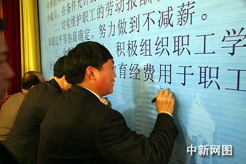 記者在現(xiàn)場看到,《共同約定書》中企業(yè)方的承諾主要是:企業(yè)依法采取縮短工時,適時安排年休假和特別休假、輪崗輪休等形式保障職工崗位,做到不減薪、不裁員或少裁員。企業(yè)要組織職工學(xué)習(xí)新技術(shù),而且企業(yè)教育經(jīng)費(fèi)用于職工培訓(xùn)不少于70%。另一方面,職工方作出了立足本職、愛崗敬業(yè)、積極為企業(yè)發(fā)展獻(xiàn)計出力等承諾。