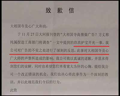 圖片03:記者對(duì)玖玖理療褲的虛假廣告進(jìn)行調(diào)查時(shí),河南開封大相國寺向記者出具了一份玖玖理療褲河南開封經(jīng)銷商,寫給大相國寺的一封致歉信,承認(rèn)自己假冒僧人的錯(cuò)誤行為,從此廣告中來自大相國寺的高僧空智,就如同人間蒸發(fā),再也沒有出現(xiàn)過,取而代之的是佛教禪宗第36代傳人,但卻有著相同的名字和面孔——空智。