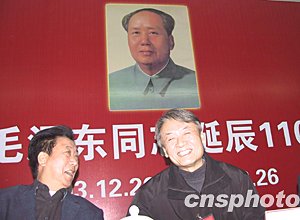 在毛澤東誕辰一百一十周年之際,韶山迎來毛澤東弟弟毛澤民之子——毛遠(yuǎn)新。毛遠(yuǎn)新是哈爾濱軍事工程學(xué)院的高才生,一九七五年在毛澤東病重期間出任其聯(lián)絡(luò)員,負(fù)責(zé)向中共中央政治局傳達(dá)毛澤東的指示。一九七六年入獄,一九九三年刑滿出獄后到上海汽車工業(yè)質(zhì)量檢測研究所工作,二零零一年退休。圖為毛遠(yuǎn)新(右)出席韶山市紀(jì)念毛澤東誕辰一百一十周年座談會。作者:殷敏鴻