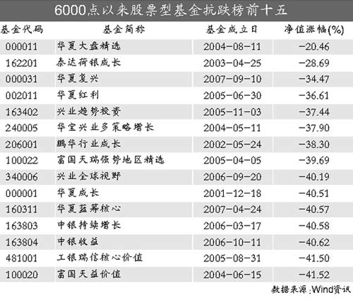 從6100多點(diǎn)以來,上證指數(shù)的跌幅已超過了65%。而華夏紅利等4只基金的凈值損失不到其一半。華夏大盤的凈值損失只有20%左右。興業(yè)趨勢、華寶多策略增長等基金凈值也損失了不到40%。相反,部分基金在熊市的跌幅甚至超過了60%。