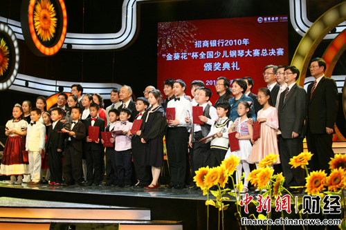 活動現(xiàn)場,招商銀行和中國兒童少年基金會合作成立了金葵花兒童成長基金鋼琴藝術(shù)計劃,招商銀行丁行長和兒童基金會領(lǐng)導(dǎo)共同舉行了揭牌儀式。此計劃將資助有鋼琴天賦卻家庭困難的兒童,以實現(xiàn)他們的鋼琴夢想;饡诂F(xiàn)場將第一筆基金頒發(fā)給2008年參賽的盲人琴童來佳俊,和本屆參賽的琴童盧星宇,以鼓勵他們在鋼琴道路上越走越遠。 (中新網(wǎng)財經(jīng)頻道)