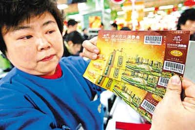 據(jù)杭州市貿(mào)易局統(tǒng)計(jì),消費(fèi)券使用以超市為主。有關(guān)人士分析,因?yàn)槭忻耦I(lǐng)到的消費(fèi)券多在幾百元,買(mǎi)太貴的東西也不合算,所以超市的食品、滋補(bǔ)品最受青睞。