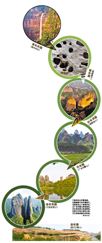 “中國(guó)丹霞”項(xiàng)目提名地包括廣東丹霞山、貴州赤水、福建泰寧、湖南崀山、江西龍虎山、浙江江郎山等6個(gè)省的6處國(guó)家級(jí)風(fēng)景名勝區(qū),它們分別代表了丹霞地貌從青年、壯年向老年演化的典型過(guò)程,構(gòu)成了一個(gè)不同發(fā)育階段和不同景觀類型的完整系列,具有全球意義和突出普遍價(jià)值。