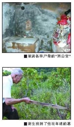 終于等來了曾做過“土公”的謝生。謝生今年76歲了,稍稍有些駝背,走路有些緩慢,但老人的頭腦非常清楚,眼中閃爍著令人敬畏的智慧的光芒。對(duì)記者提出的問題,老人回答得非常準(zhǔn)確,不夸大事實(shí),如果不知道也不妄加猜測(cè)。“我只搬過不到10個(gè)‘黃金甕’,都搬到鷓鴣山了。另一位‘土公’謝興搬得多,得有100多個(gè),可惜他已經(jīng)去世了?吹降摹S金’很多都爛掉了,大部分只剩下了腿骨和手臂,少部分還存有一點(diǎn)點(diǎn)頭皮骨——腿骨和天靈蓋鈣質(zhì)比較多,所以一般保存得長(zhǎng)久一些。腿骨很短,也就一個(gè)半拳頭長(zhǎng)”,老人邊說邊用兩個(gè)拳頭在自己的小腿前比畫著。