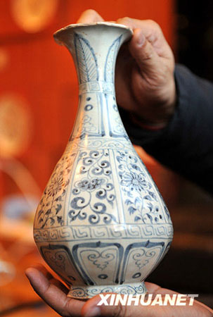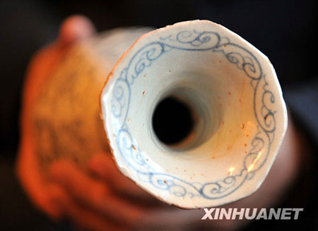 元代青花八方玉壺春瓶造型曲線優(yōu)美、繪畫線條流暢自如,陶瓷考古專家認為代表了當年高超的制瓷工藝和繪畫水準。新華社記者 章武攝