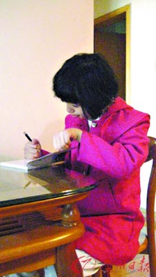 淡粉色毛衣、棗紅色外套、白色褲子、可愛的娃娃頭短發(fā),瘦小的陳楠看起來像是一名中學生。盡管她每邁一步就要停下一會調整步伐,但當記者走進她家時,她還是熱情地起身到門口迎接。雖然說話比較費力,吐字也并不清晰,但她的思維和反應都很快,她會側仰著頭仔細傾聽你的問題,然后迅速接下話茬,努力嚅動嘴唇發(fā)音,說到興起之處,她還會像個孩子般發(fā)出爽朗的笑聲。“我最大的夢想就是當個作家,不過還真沒想到在25歲時就能出書呢!